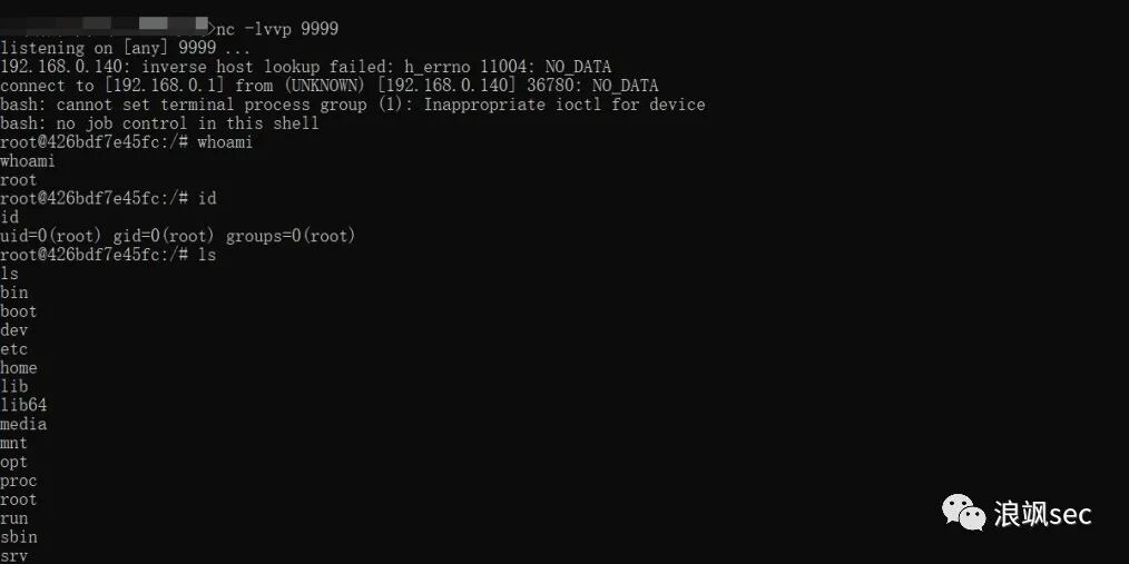 过一会儿,反弹shell就会弹出,root权限,能够正常执行命令