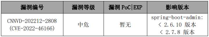 近日,嘉诚安全监测到CNNVD官方发布了Spring Boot Admins 远程代码执行漏洞的风险通告,漏洞编号为:CNNVD-202212-2808(CVE-2022-46166)。