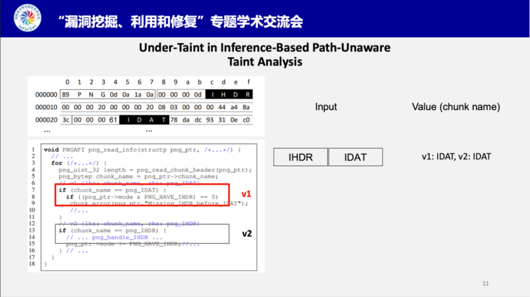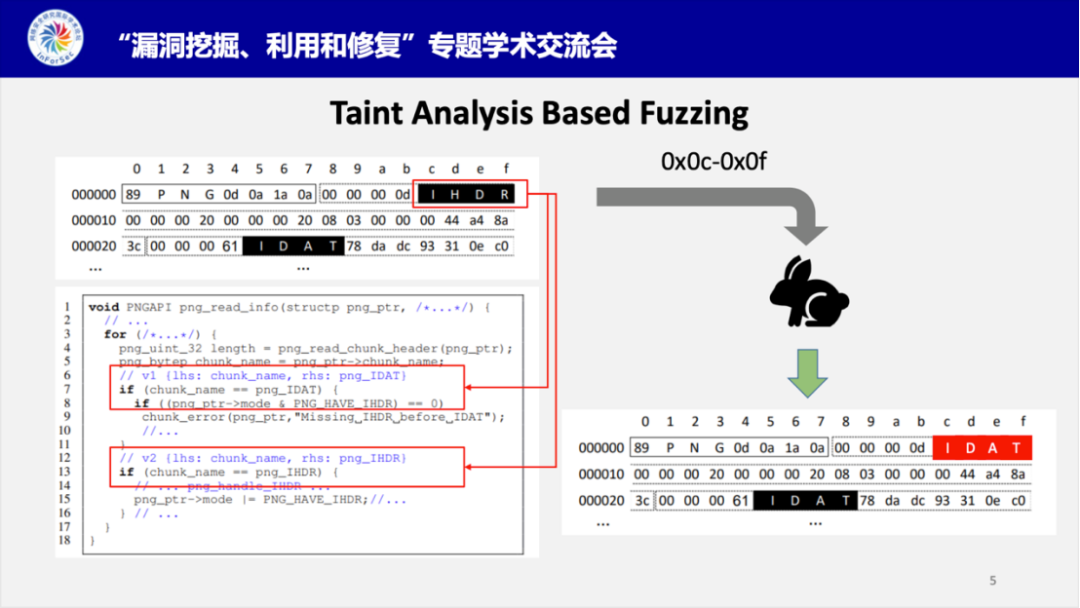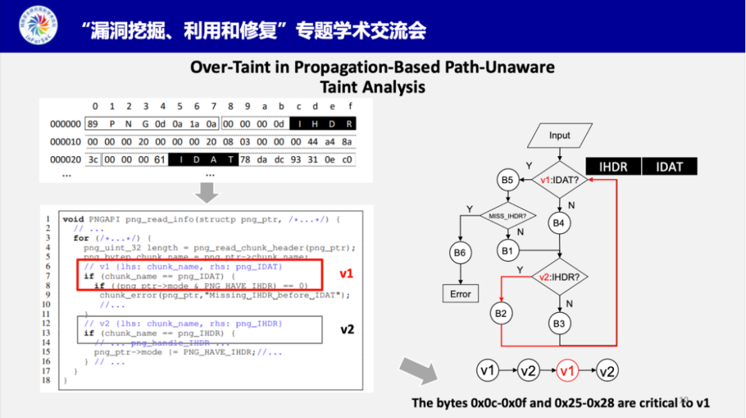 梁博士首先介绍了污点分析技术在模糊测试技术中的广泛使用和重要作用。利用污点分析技术,模糊测试工具可以识别出影响程序分支的输入字节,通过只变异这些关键数据字节来生成输入,使得模糊测试工具可以更高效的探索程序。