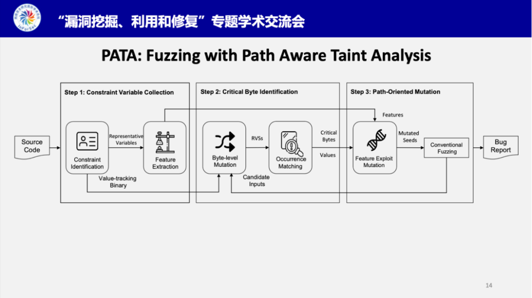 针对这一问题,梁博士介绍了本文提出的解决方案,即路径感知的污点分析技术辅助的模糊测试工具-PATA。该技术可以准确识别和区分程序中多次出现的分支约束和输入之间的对应关系。工具包含三个关键步骤。第一步,对程序中的约束变量进行提取和表示,梁博士提出了代表性变量(representative variable)这一概念来解决这一问题。第二步,通过对输入进行变异,收集输入和代表性变量之间的对应关系。第三步,利用收集到的污点信息,梁博士提出了相应的变异策略。