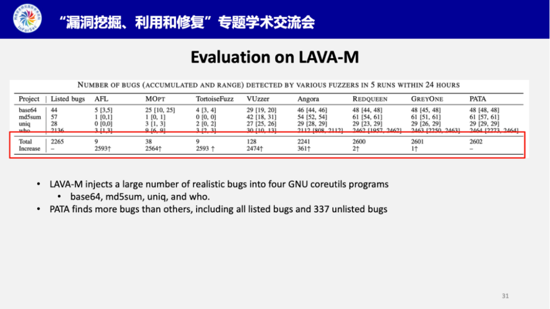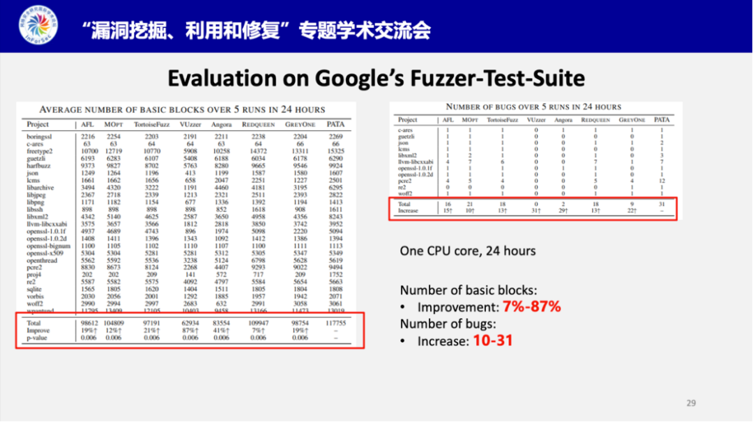 最后,梁博士介绍了对该工具的实验结果。梁博士在Google’s Fuzzer-Test-Suite和LAVA-M上将PATA同相关工作进行了实验对比。结果表明,PATA在程序基本块覆盖率上相对已有工作提高了7%至87%,并多发现了10-31个程序漏洞。在LAVA-M测试集中,PATA表现最好,并发现了337个未列出的漏洞。另外,PATA在现实程序中发现了40个未知漏洞,其中12个被赋予CVE编号。