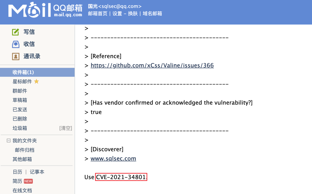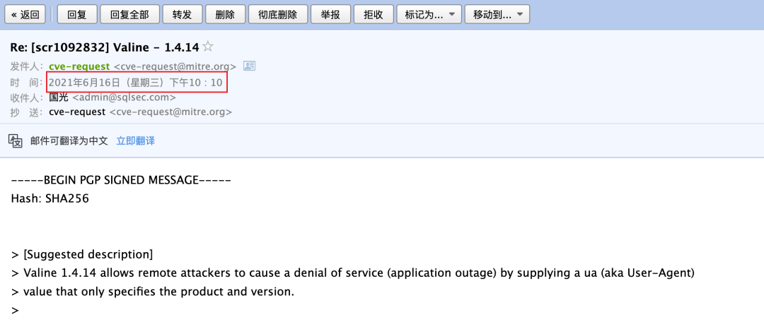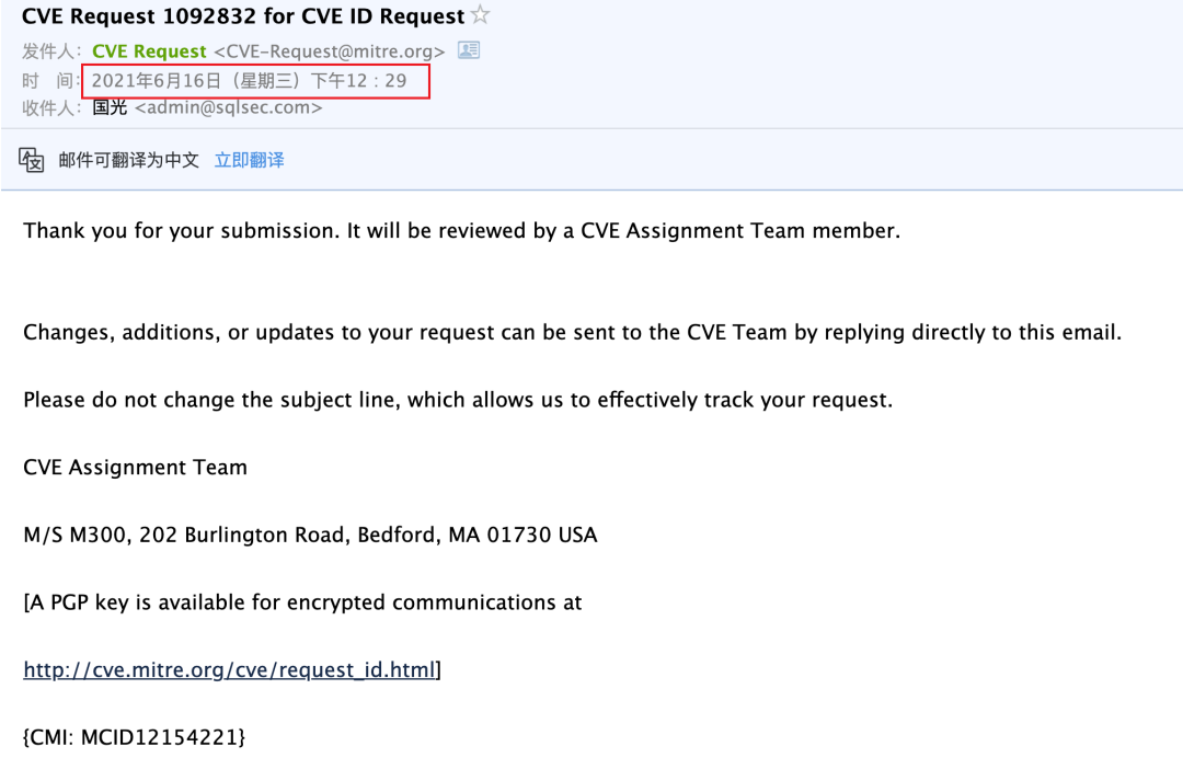可以看到中午提交漏洞,晚上就收到 CVE 编号的邮件了,效率比我 18 年的时候快了很多(18 年的时候基本上得两三天时间)