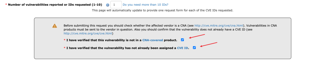 「Number of vulnerabilities reported or IDs requested (1-10)」报告的漏洞或请求的 ID 数,国光填的默认 1