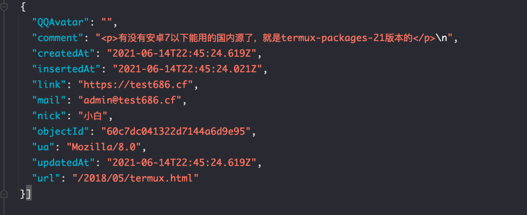 import jsonimport requests# 读取 json 文件并返回数组def get_comments(path):with open(path, 'r', encoding='UTF-8') as jsonfile:json_list = json.load(jsonfile)return json_listdef main():# 这个是抓取提交评论的数据包的 URLurl = "https://cn-n1-console-api.leancloud.cn/1.1/classes/Comment?fetchWhenSave=true"headers = {"Host": "cn-n1-console-api.leancloud.cn","X-Lc-Ua": "LeanCloud-JS-SDK/0.0.26(Browser)",...这里老老实实填写抓包时候的 headers..."Accept-Encoding": "gzip, deflate"}# 读取 termux.json 位置的文件comments = get_comments('termux.json')# 对评论进行切片comment = comments[:50]# 考虑到评论互相引用的情况,所以得有 pid 和 ridif 'pid' in comment:pid = comment['pid']rid = comment['rid']else:pid = ""rid = ""# 提交评论的基础格式data = {"ACL": {"*": {"read": True}},"isNotified": False,"pid": pid,"rid": rid,"comment": f"{comment['comment']}","objectId": f"{comment['objectId']}","insertedAt": {"__type": "Date","iso": f"{comment['insertedAt']}"},"createdAt": {"__type": "Date","iso": f"{comment['createdAt']}"},"link": f"{comment['link']}","mail": f"{comment['mail']}","nick": f"{comment['nick']}","ua": f"{comment['ua']}","url": f"{comment['url']}"}# 发起提交评论的请求r = requests.post(url=url, headers=headers, data=json.dumps(data))if __name__ == '__main__':main()