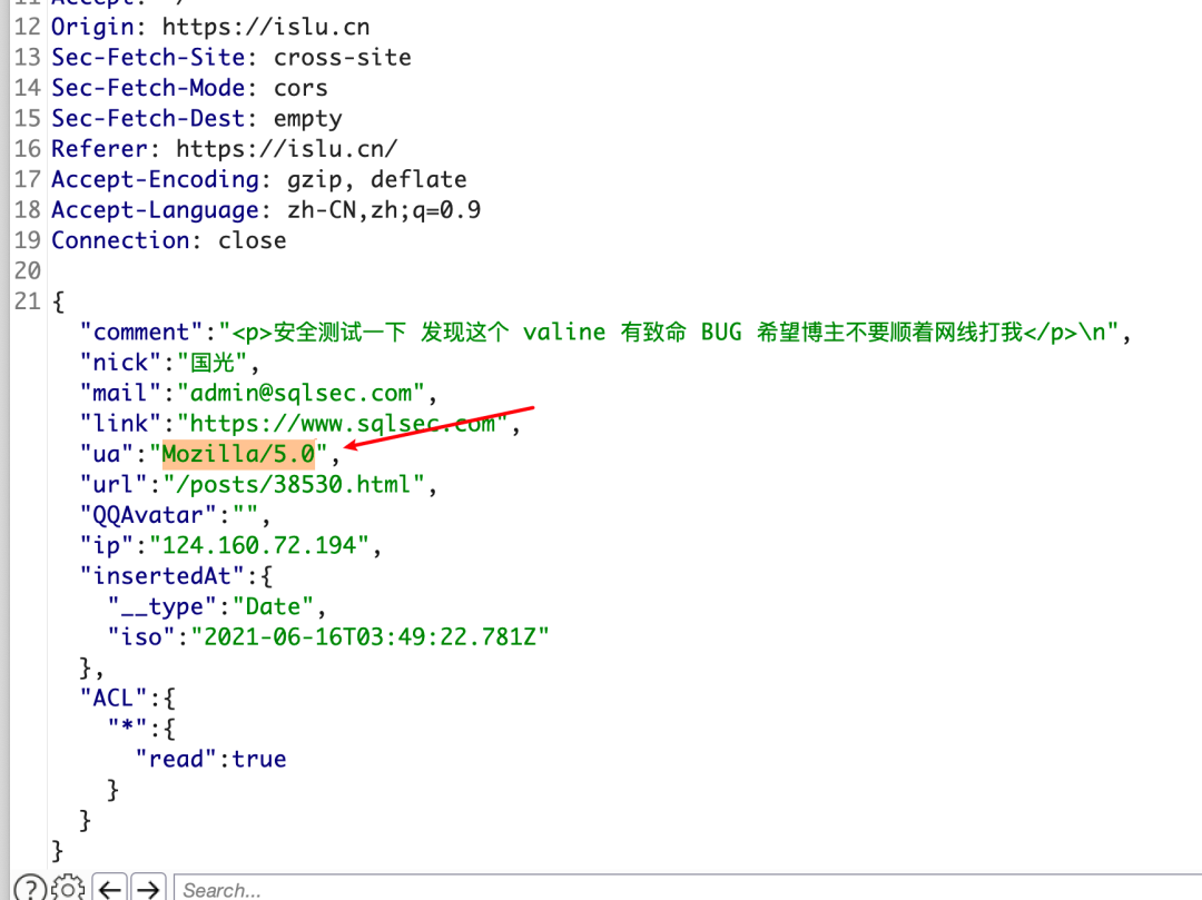 找到了罪魁祸首,这个评论插进去,我的评论就挂了。简单 Fuzz 发现根本问题出在了 UA 里面,这个用户评论的 UA 很短,新版本的 Valine 会根据用户的 UA 会识别用户的操作系统和浏览器类型,因为这个 UA 很短,直接导致 Valine 的相关 JS 直接异常,从而导致整个评论挂了。
