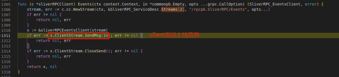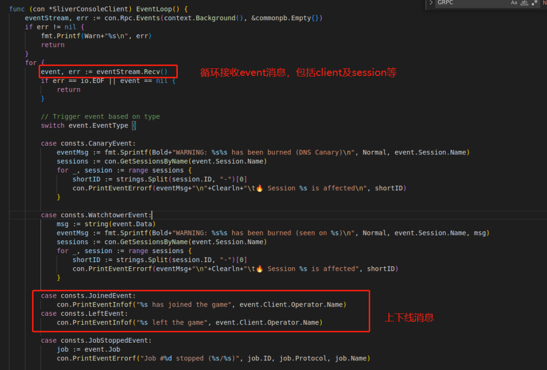 client运行上线时首先遍历~./sliver-client/config(Linux)文件下config配置进行选择连接,然后初始化event循环时会发送上线;