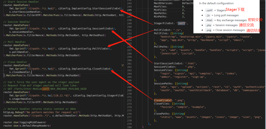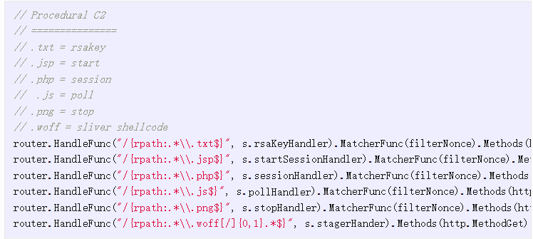 Sliver处在高速发展中,相关检测难度也越来越大,这点可以从通信密钥交换以及证书特征就可见一斑。首先需要了解的是Sliver是根据流量通信中不同的文件名来确定消息类型,当前源码。如下图所示: