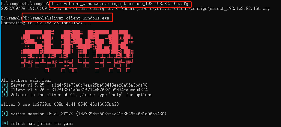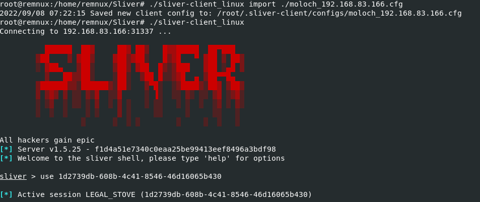 而Sliver没有相关默认的投递载荷方式,需要使用者自己编写相关代码进行投递,笔者直接复制生成的木马在windows(ip:192.168.83.163)和系统为linux(ip:192.168.83.167)的被控机直接运行。