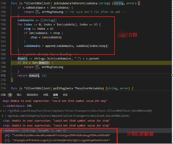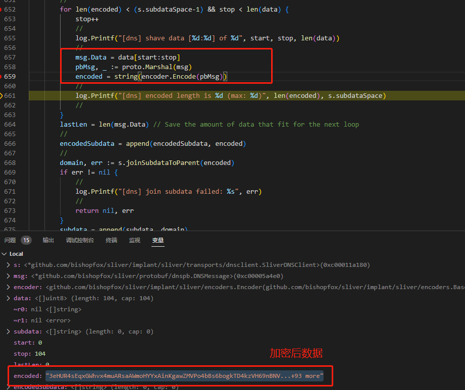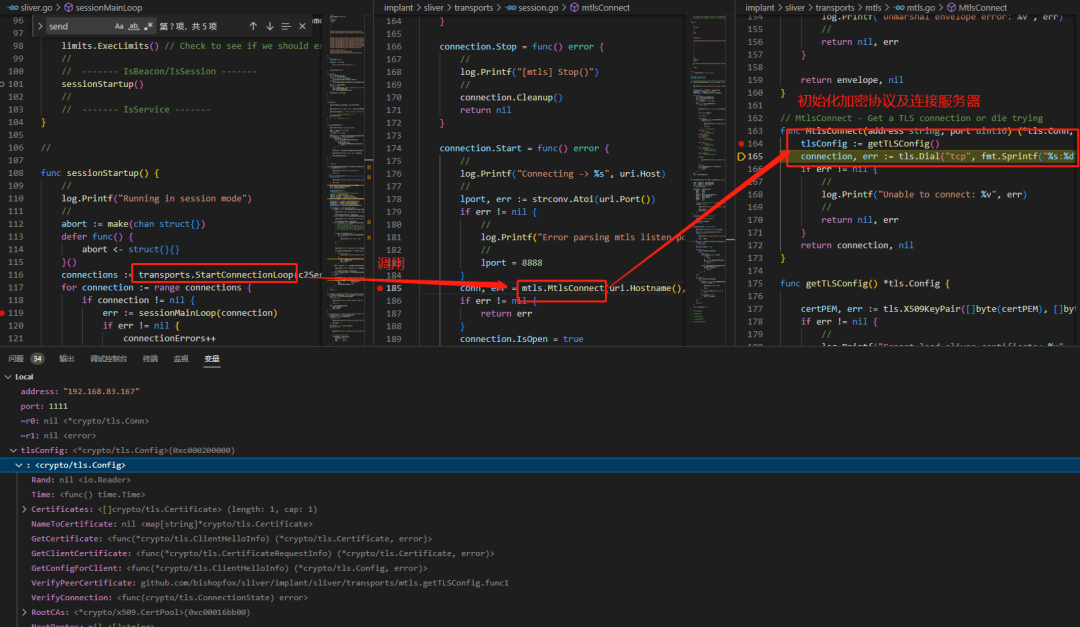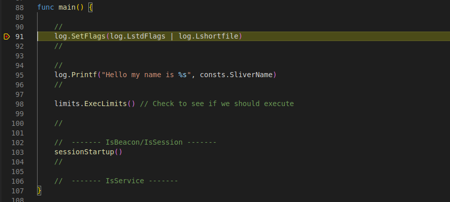 4.在Sliver的sliver.go文件中的main函数下断点,F5进行调试,以下为调试成功界面: