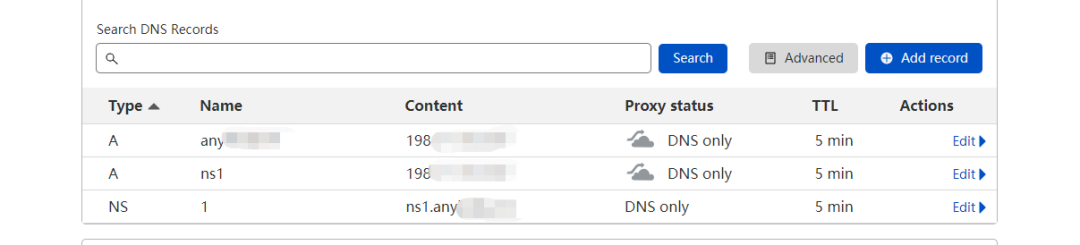 由于本地服务器配置上线失败,遂使用线上服务器进行配置,相关域名及dns配置如下所示,创建域名及ns子域名指向vps服务器,然后DNS域名NS指向创建的ns域名即可。