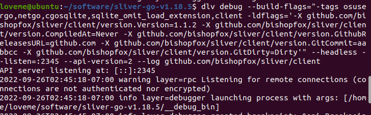 dlv debug --build-flags="-tags osusergo,netgo,cgosqlite,sqlite_omit_load_extension,client -ldflags='-X github.com/bishopfox/sliver/client/version.Version=1.1.2 -X github.com/bishopfox/sliver/client/version.CompiledAt=Never -X github.com/bishopfox/sliver/client/version.GithubReleasesURL=github.com -X github.com/bishopfox/sliver/client/version.GitCommit=aabbcc -X github.com/bishopfox/sliver/client/version.GitDirty=Dirty'" --headless --listen=:2345 --api-version=2 --log github.com/bishopfox/sliver/client