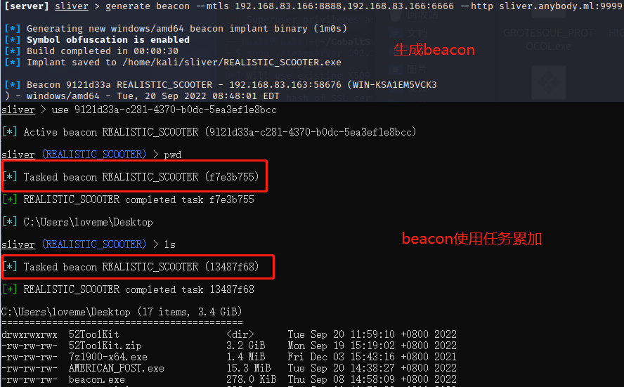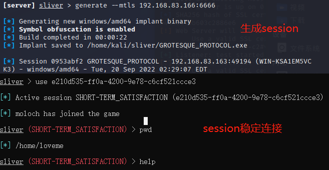 生成Implant则是通过选择的配置去构造不同的编译命令,如下图所示编译生成一个使用mtls协议,C2为192.168.83.167:1111。下图为生成session/beacon的调用方式: