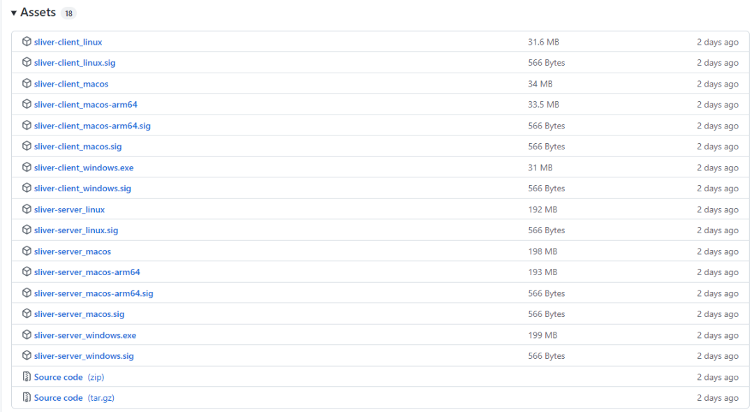 Sliver官方提供了不同客户端及服务端的安装文件,包括windows、linux和macos系统,基本覆盖了流行系统,做到了大部分平台适配,下载地址为https://github.com/BishopFox/sliver/releases。如下图所示: