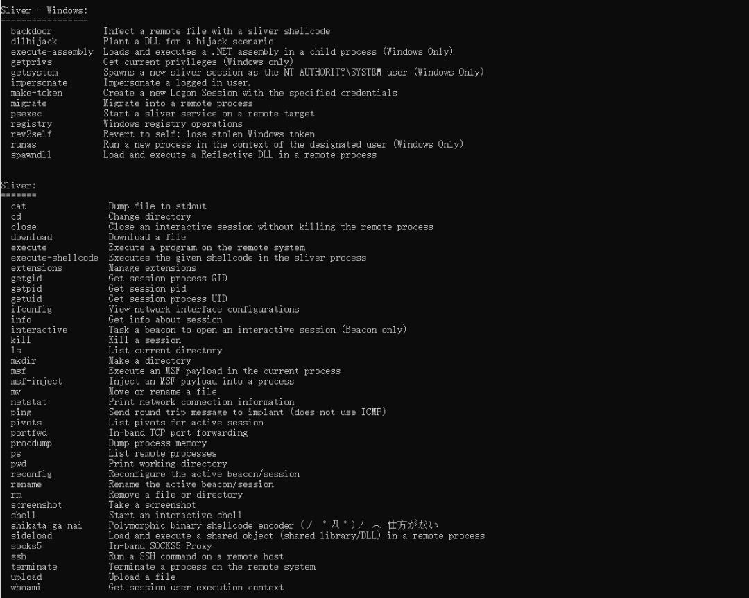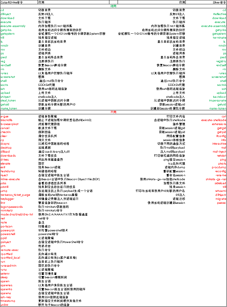 Sliver载荷基本功能对比如下表所示,与CobaltStrike对比发现目前功能仍相对较少,尤其是一些权限提取及数据获取方面稍显不足。
