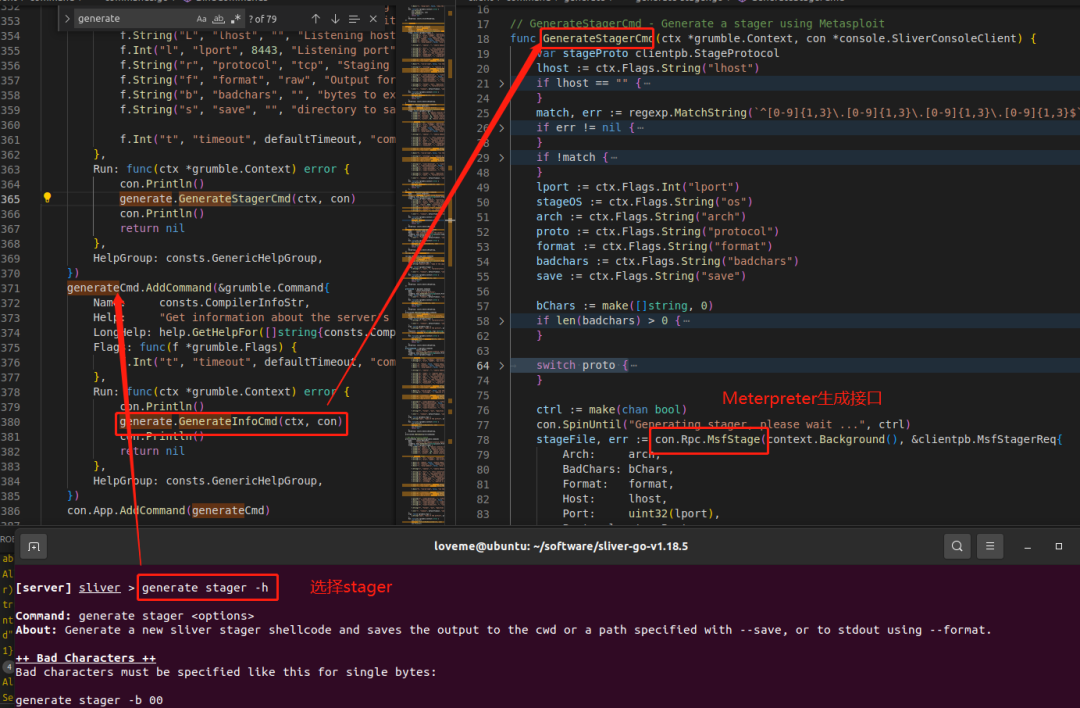 对于需要限制载荷长度的环境下,Sliver使用两种方式进行分阶段注入。可以采用Meterpreter框架生成stager,下图为Sliver生成stager过程。