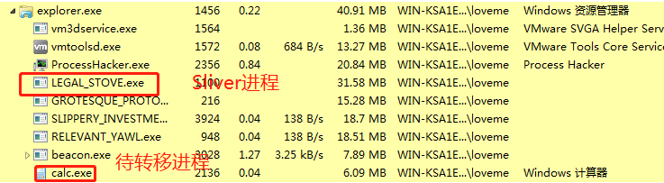 相关样本由于是双击打开,所以父进程是explore.exe,准备转移的进程为calc.exe,pid为2136。