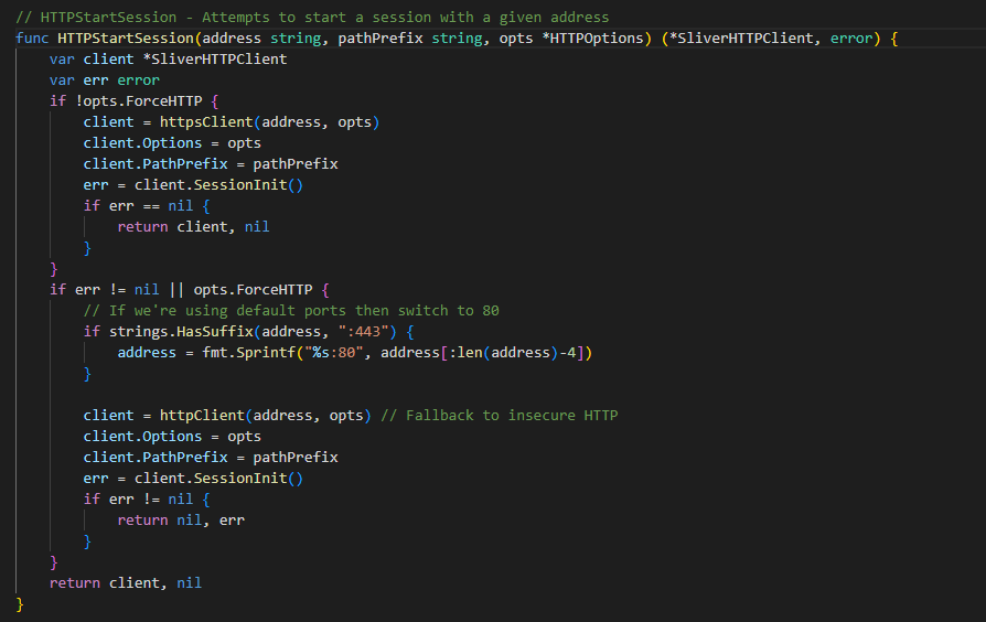 通过服务端生成的配置信息可以看出,服务端与客户端通信验证方式为ECC非对称加密算法。CobaltStrike客户端是向Teamserver(CobaltStrike服务端)发送指定的java通信打包的登陆密码即可登录,存在爆破的可能性,而且由于登录返回信息与正常流量存在差异,对于暴露在外的服务器可以进行全网扫描探测,所以不得不对CobaltStrike进行二次开发以规避风险。而Sliver只有获取相应私钥才能与之服务端进行通信,安全性会得到很大的保障。