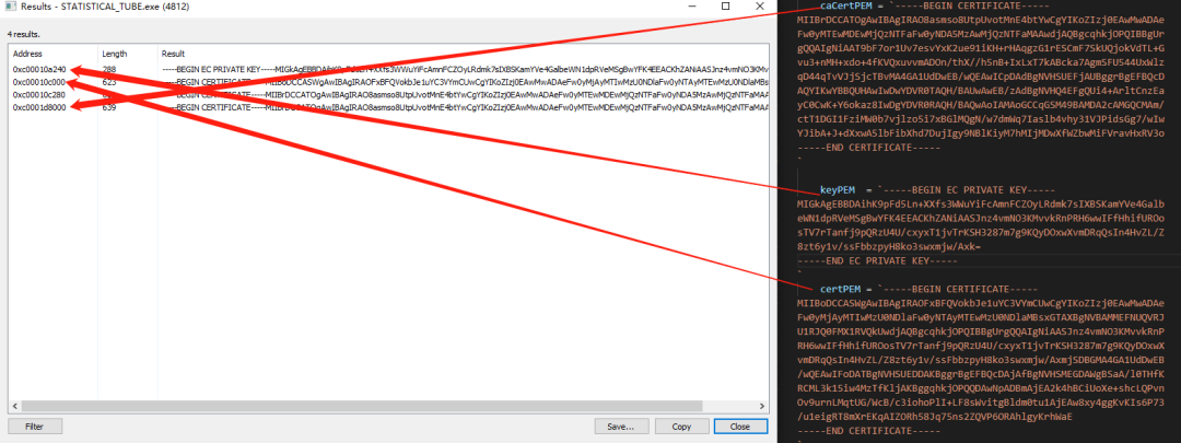 如下图所示,可以通过内存特征获取证书,一旦获取到相关证书,便可以构造上线包进行伪造上线。