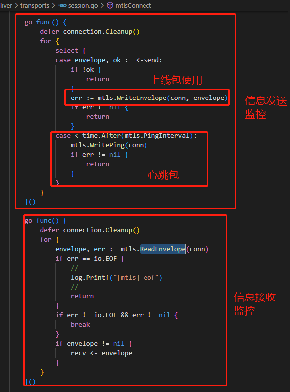 1.准备工作:初始化加密协议及连接服务器、构建信息发送监控循环及信息接收监控循环如下图所示;