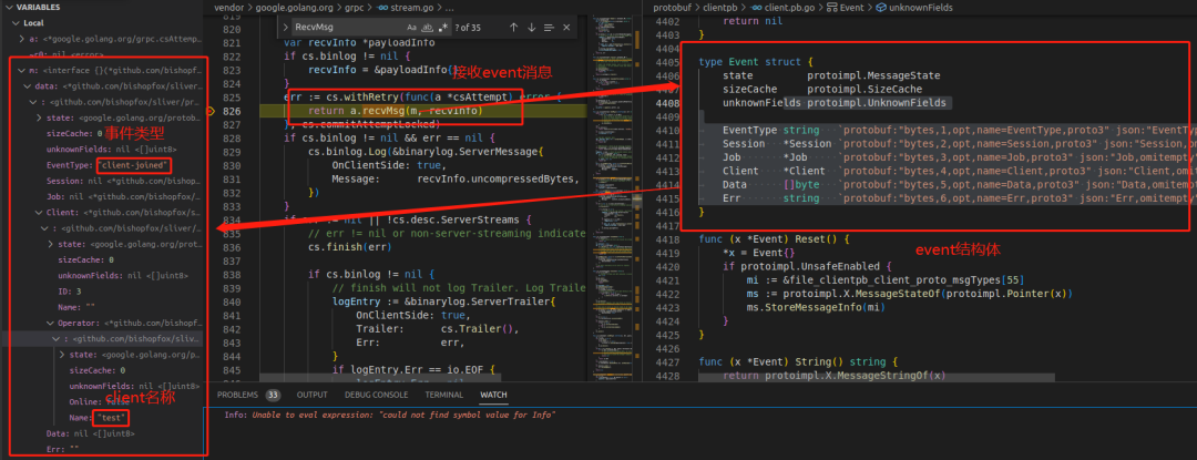 5.在server/client的main.go文件中的main函数下断点,F5进行调试,以下为调试成功界面: