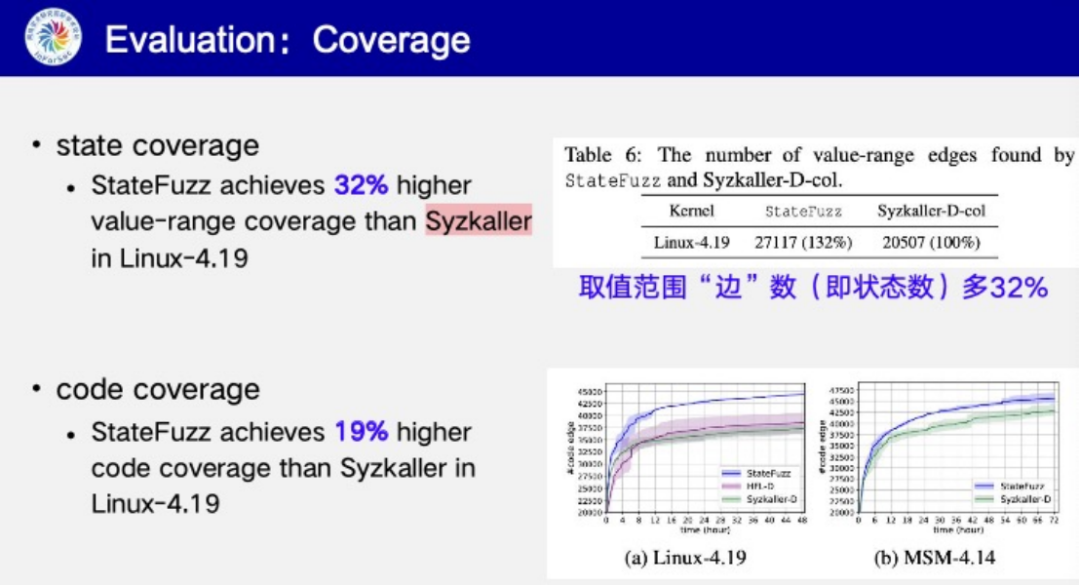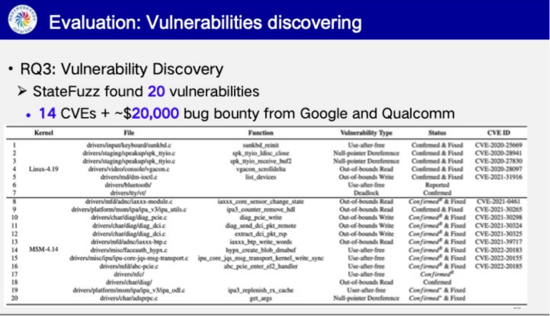 最后,赵博士介绍本篇工作在覆盖率和漏洞挖掘上的优异表现,状态覆盖率和代码覆盖率比Syzkaller工具分别多32%和19%。同时,在Linux驱动和Android驱动上发现了20个漏洞。