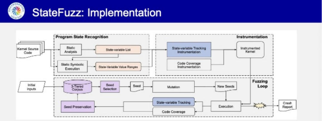 然后,赵博士介绍本篇工具实现的工具StateFuzz,针对Linux驱动的状态感知的模糊测试工具。工具采用用户动作共享的变量作为状态,用静态分析和符号执行识别这些状态变量,并推断出变量的值范围。第二步对驱动进行插桩,来追踪所有状态变量的值,这里采用的是状态变量的值的结合作为反馈。最后,进行fuzzing测试,保留那些有新的覆盖率、状态变量值集或者状态变量极值的输入作为seed。