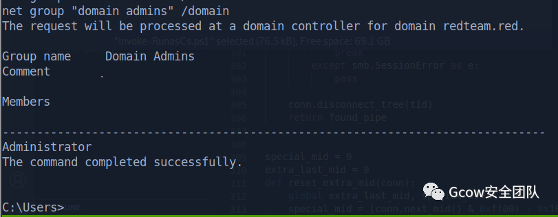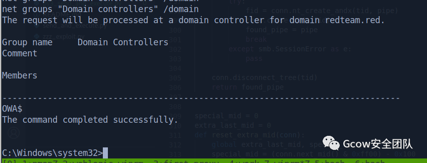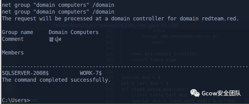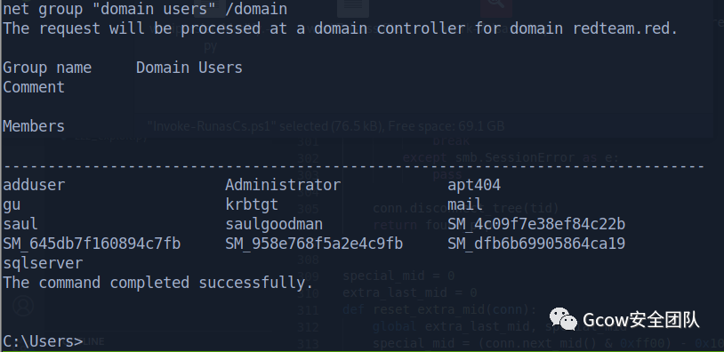 net group "domain users" /domainThe request will be processed at a domain controller for domain redteam.red.Group name Domain UsersCommentMembers-------------------------------------------------------------------------------adduser Administrator apt404gu krbtgt mailsaul saulgoodman SM_4c09f7e38ef84c22bSM_645db7f160894c7fb SM_958e768f5a2e4c9fb SM_dfb6b69905864ca19sqlserverThe command completed successfully.