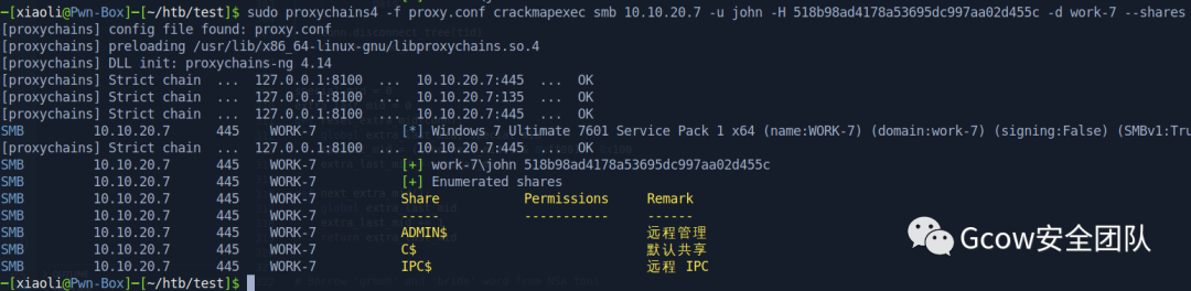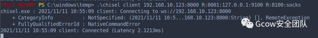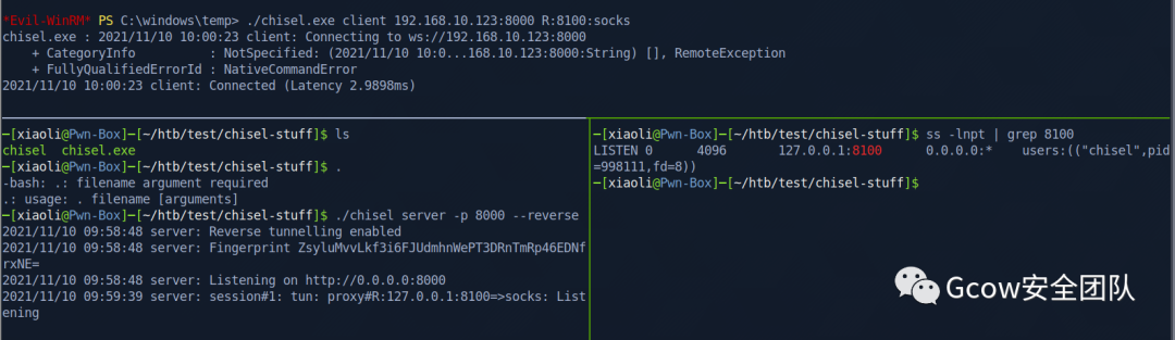 回到入口机器,把原来的chisel client关了,重新开一个带端口转发的(此时work-7会断开,小问题,重新打回去)