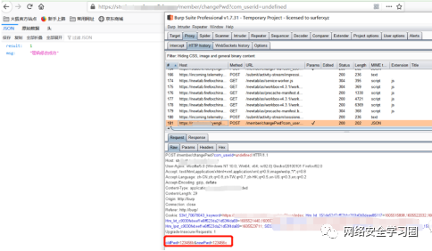 提交后,页面返回“密码修改成功”。BP抓包也显示密码被修改,则说明可以成功伪造请求进行操作,该网站的确存在CSRF漏洞。
