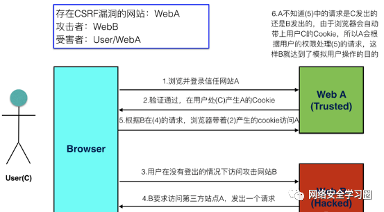 5)根据网站B的请求,在用户不知情的情况下携带Cookie信息,向网站A发出请求。网站A并不知道该请求其实是由B发起的,所以会根据用户C的Cookie信息以C的权限处理理该请求,导致来自网站B的恶意代码被执行。