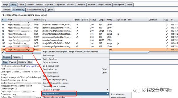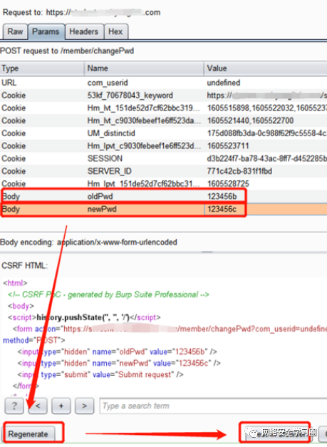 右键选择Engagement tools中的Generate CSRFPoC,修改POST包中的原始密码为页面修改的密码(123456b),修改当前密码为一个新密码(123456c)。