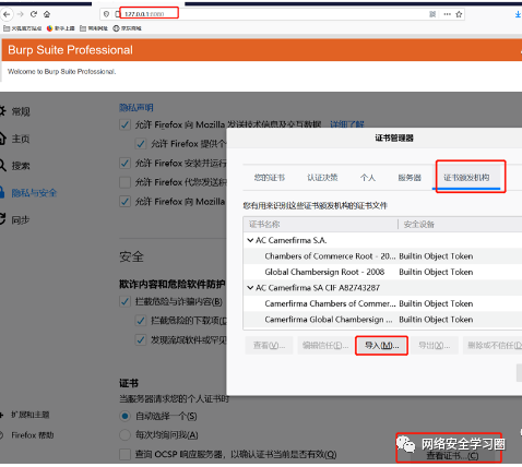 【tips】现在大多数网站为了数据传输的安全性,强制使用 HTTPS 进行通信。这时我们在使用 Burp 代理后去访问将会出现证书错误的警告,那要咋办呢?莫慌莫慌,浏览器打开127.0.0.1:8080,找到CA证书并下载后,在“证书机构”模块导入证书就好啦。