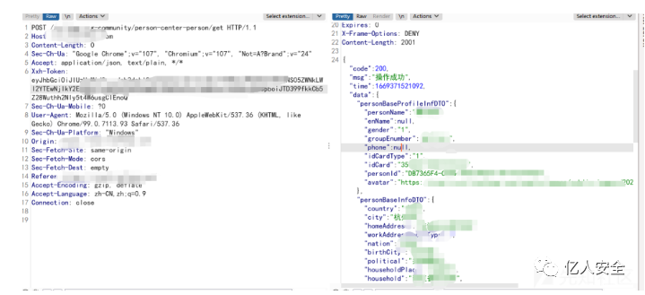 之后变换成get请求,发现某些接口直接就返回了大量的数据,如下两个接口,其中一个接口直接返回了当前我自己的信息,而且信息非常的多。根据个人经验,这种返回persion信息的地方常常都有参数可遍历,而默认情况就是返回自身数据。