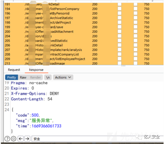 发现了一些GET/POST能够直接返回数据的接口,但是其实绝大部分的接口其实还是返回的服务异常,如果直接忽视掉这些肯定会错过很多漏洞。