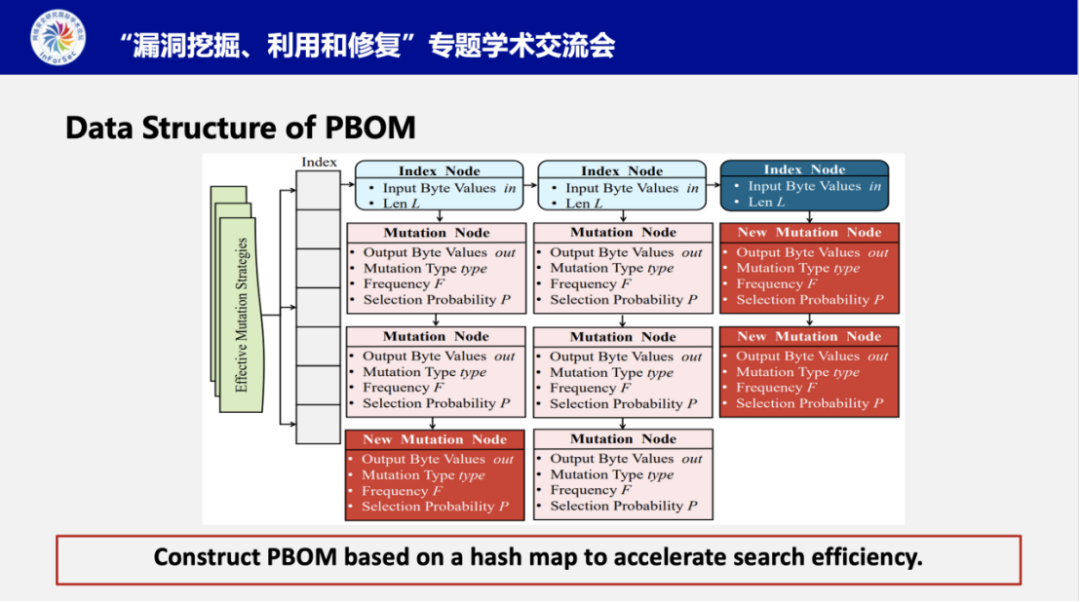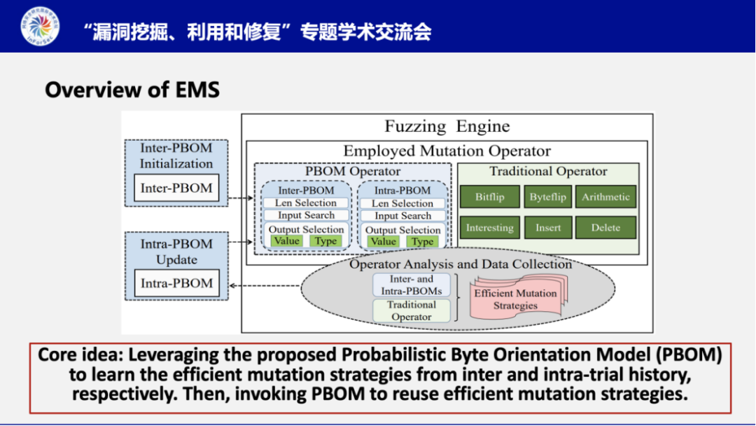 根据这些思路,梁博等人设计了历史数据驱动的模糊测试变异框架——EMS,其核心想法是利用概率字节定向模型(PBOM)从历史数据中学习有效的变异策略进行重用。