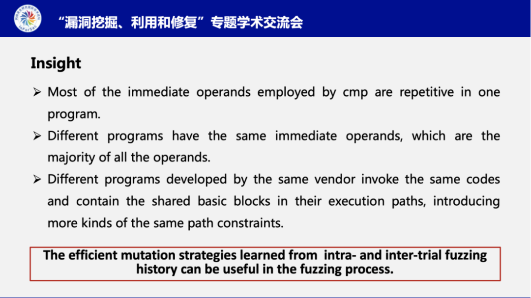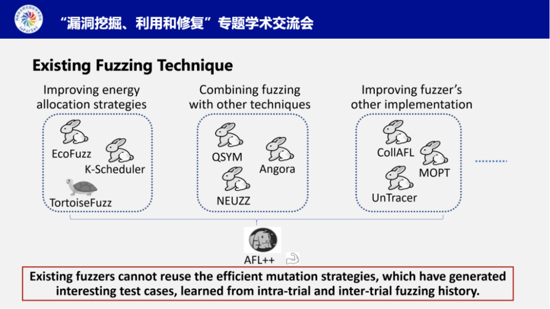 梁红博士首先介绍了模糊测试技术的主要工作机制,并对现有模糊测试技术的研究方向进行了分类总结,同时指出现有模糊测试技术未能有效利用模糊测试过程中的历史数据的问题。