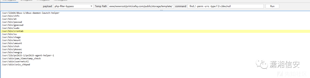 然后开始尝试suid提权,使用find / -perm -u=s -type f 2>/dev/null命令,可以找到系统上运行的所有suid可执行文件,那个命令记不住就直接上网搜。