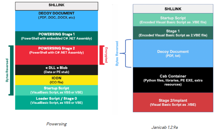 近日,Kaspersky的研究人员披露了具有白俄罗斯背景的APT组织Evilnum,使用一个新的Janicab变种针对性攻击旅行社和金融实体。该Janicab变种在整个2020年期间曾用于针对中东的法律实体的攻击。目前攻击者继续使用dead-drop技术,利用YouTube、Google+和WordPress的网络服务分发真实的C2地址。值得注意的是,此前该组织从未将旅行社作为攻击目标。攻击者使用了包含在ZIP压包中的基于LNK的Dropper发动钓鱼攻击。在某个投递Janicab的案例中,诱饵文档是一个工业(液压)公司的简介,这与之前利用PowerPepper的入侵活动中使用的诱饵文档主题一致。一旦受害者打开恶意LNK文件,一系列恶意文件就会被释放。LNK文件有一个嵌入式“命令行参数”字段,旨在提取和执行编码的VBScript加载程序(1.VBE)。后者将删除并执行另一个嵌入和编码的VBScript(2.VBE),它将提取包含其他资源和Python工具的CAB压缩文档(cab.cab),并提取和执行最后的植入物——Janicab。最后阶段还将通过在启动目录中部署一个新的LNK文件来完成持久化,并利用dead-drop技术获取实际的C2的 IP地址。Janicab和Powersing在执行流程以及VBE和VBS的使用方面非常相似,但它们的LNK文件的结构有些不同。此外,较新的Janicab变种相较于旧版还嵌入了一个CAB压缩文档,其中包含几个Python工具和其他在入侵后期会使用的组件。Janicab和Powersing的对比如下图所示。