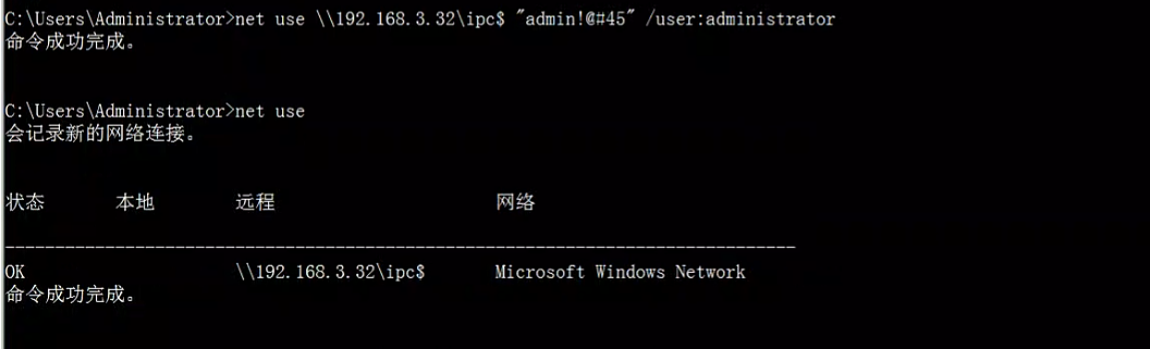 net use \\192.168.3.32 "[email protected]#45" /user:administrator