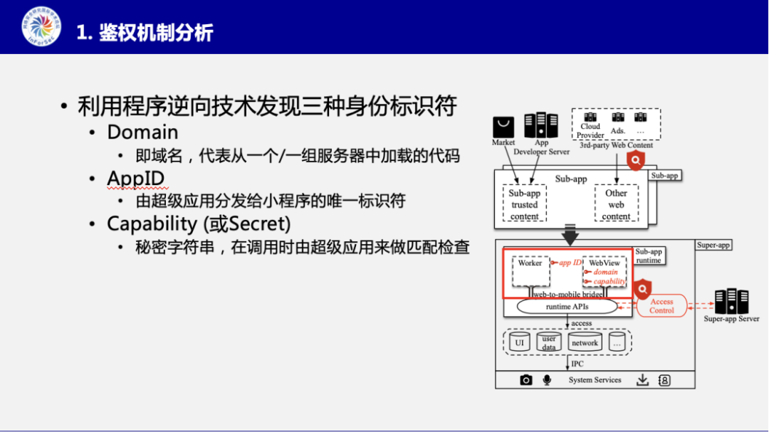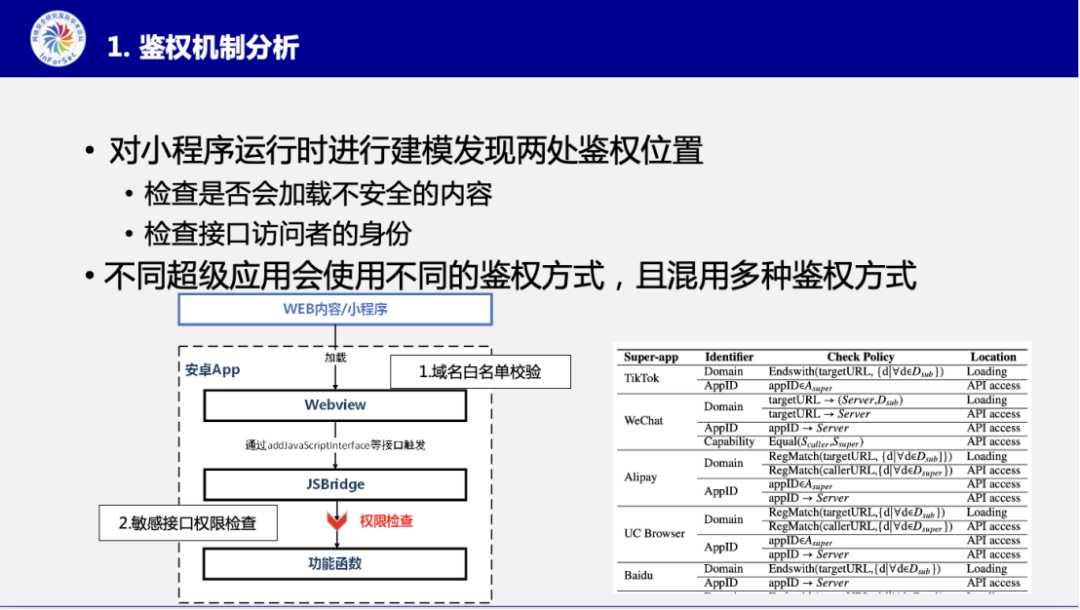 基于调研分析,张智搏博士归纳总结了小程序生态中用来做检查的三类身份标识:即域名,小程序ID,和能力。以及当前鉴权位置存在两处:一方面在加载外部资源的时候,会采用基于域名白名单的方式进行检查,另一方面,在通过JSBridge调用特权接口的时候,也会存在身份检查。