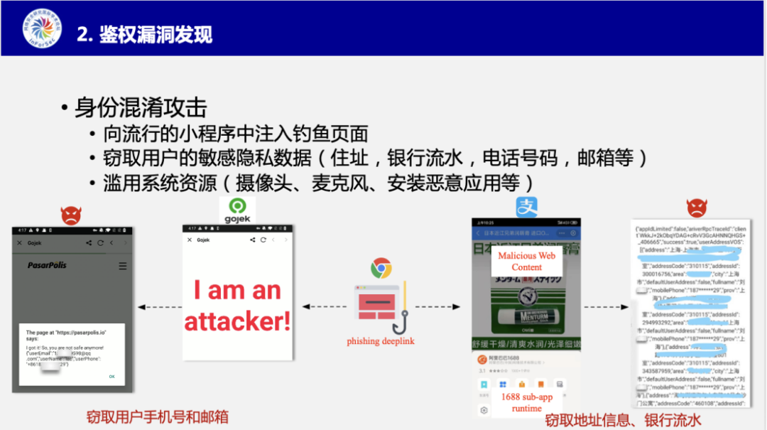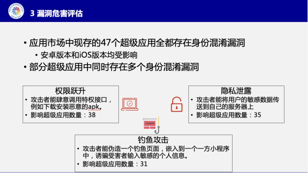 此外,张智搏博士介绍了该漏洞挖掘工作的实验结果以及发现的安全后果。指出47个被研究的超级应用普遍存在身份混淆漏洞,有38个超级应用中会被权限跃升,31个超级应用存在钓鱼攻击的风险,以及35个超级应用存在隐私泄露的风险。