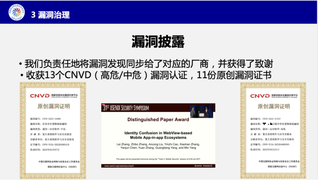最后,张博士介绍到,他们已经将发现的安全问题同步给了相应的超级应用厂商,不仅获得多份原创漏洞证书,他们的研究成果还在2022年的USENIX Security顶级网安会议上获得了杰出论文奖。